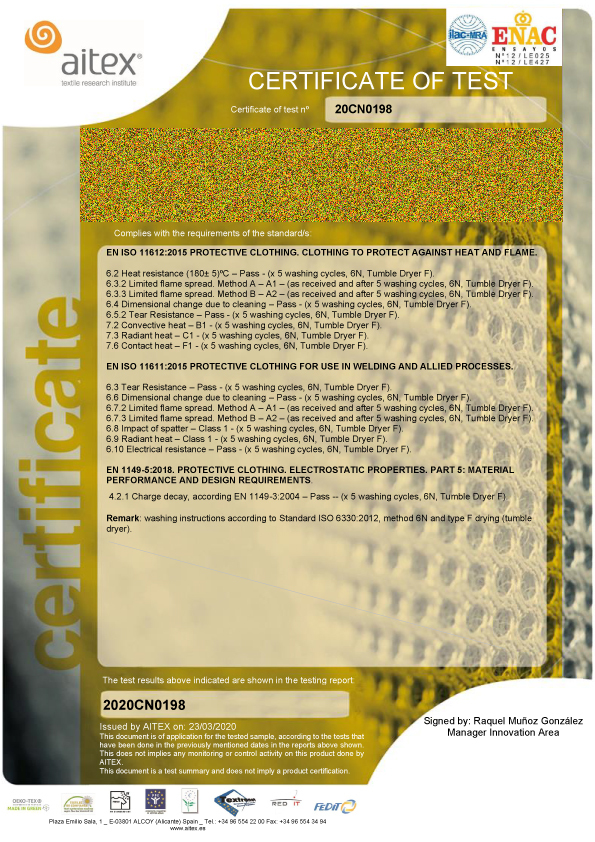 | EN ISO 11612: Heat/flame protective clothing | A2, B1, C1, F1 |